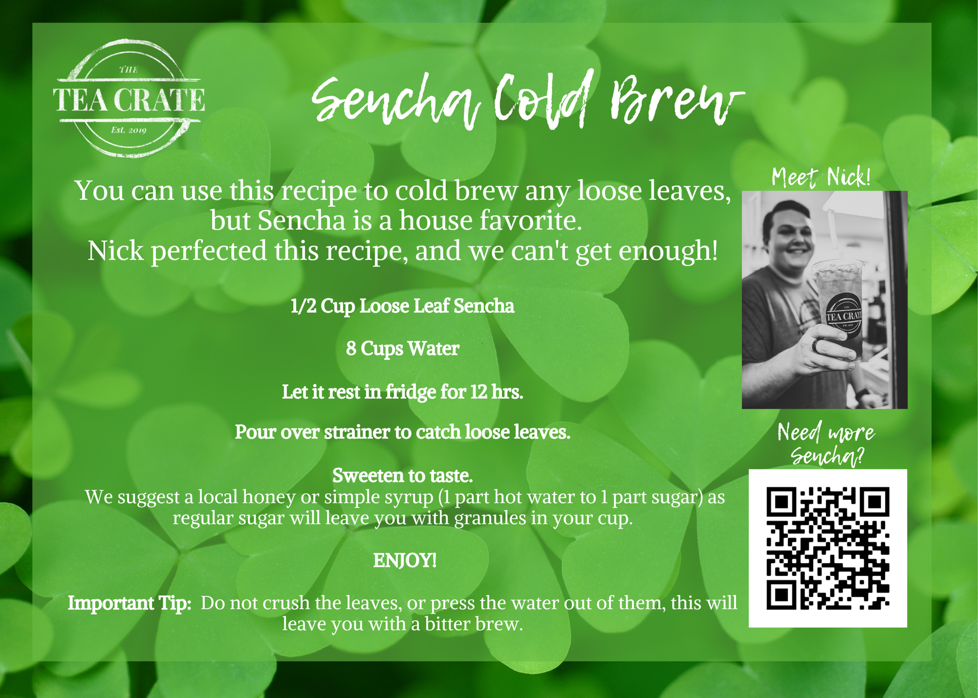 Sencha Cold Brew Apr 8 Written By Shaelyn Ellyson We all know that cold brew is all the rage in the coffee world, but you best not count tea out when it comes to a fabulous cold brew!Nick shares his super easy recipe here! Wanna try it? Grab Some Sencha Here! Green TeaSenchaCold BrewIced TeaRecipesTea RecipesThe Tea CrateMy Tea CrateTeaCrateGreen Shaelyn Ellyson
